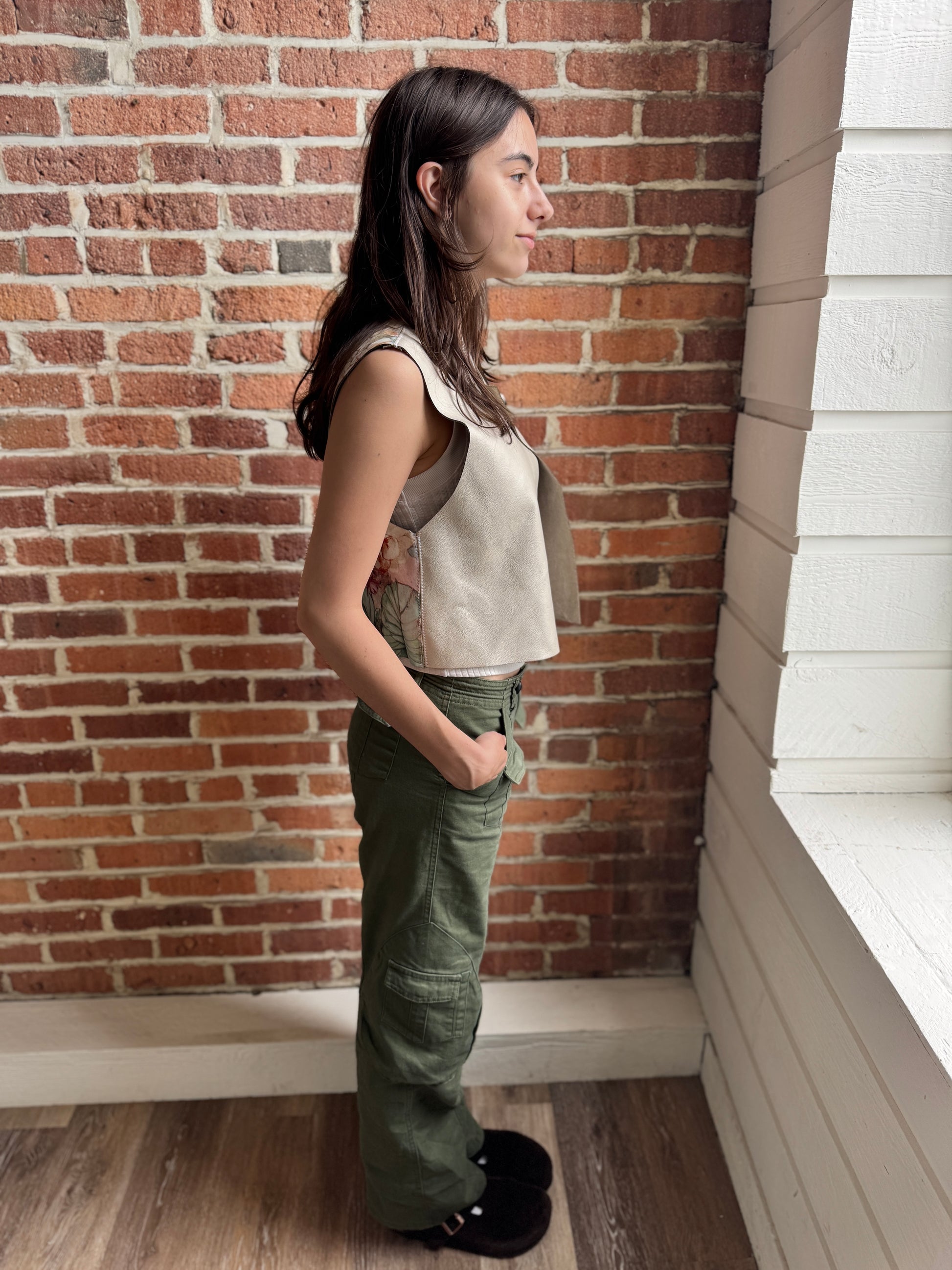 "Floral POP" Split Tee Top is a modern take on a traditional vest with a single button closure at neckline and a flared, slightly structured open front. We describe this colorway as "business in the front and party in the back" with the addition of a fun, printed leather backpiece in a multi color macro floral!